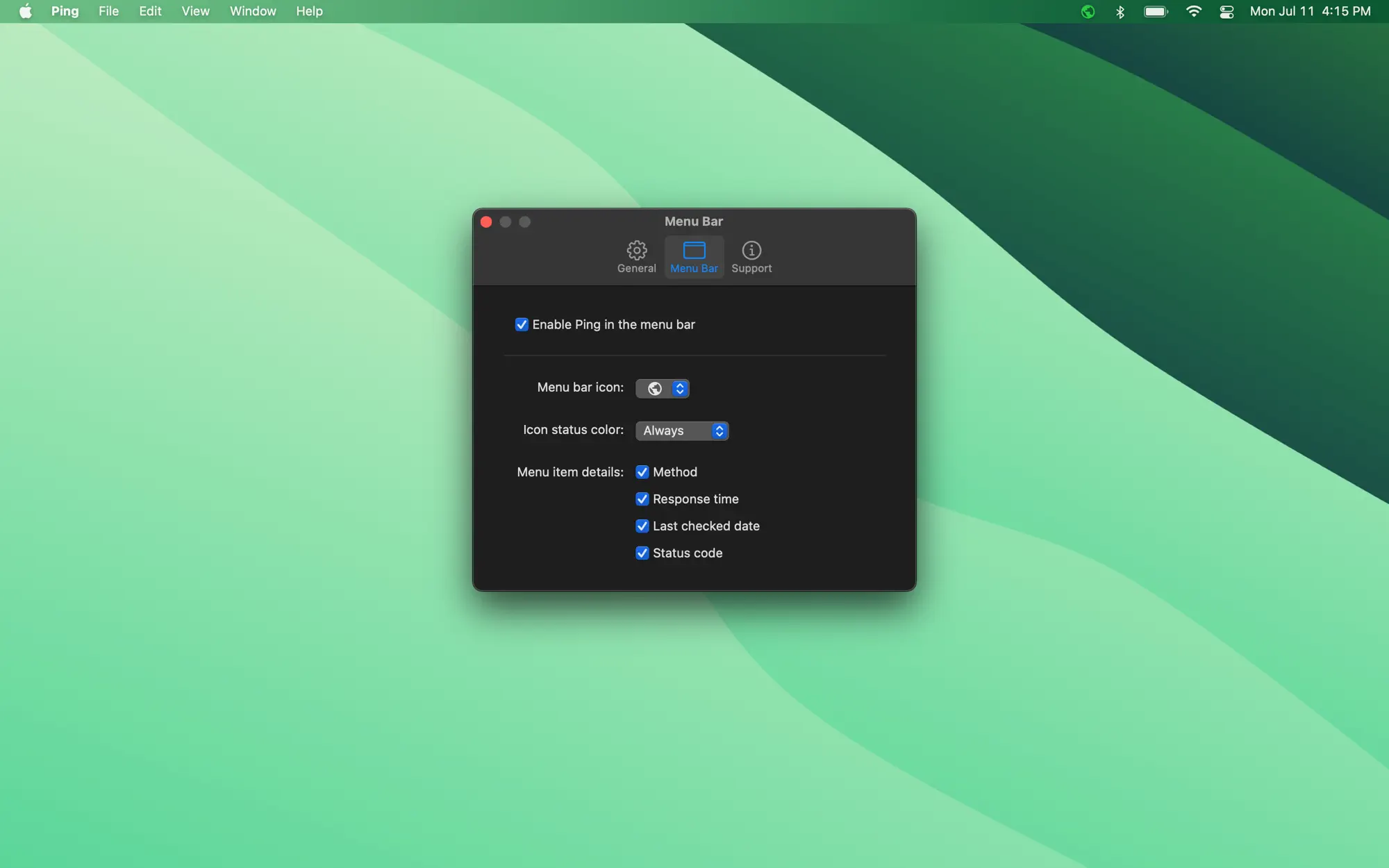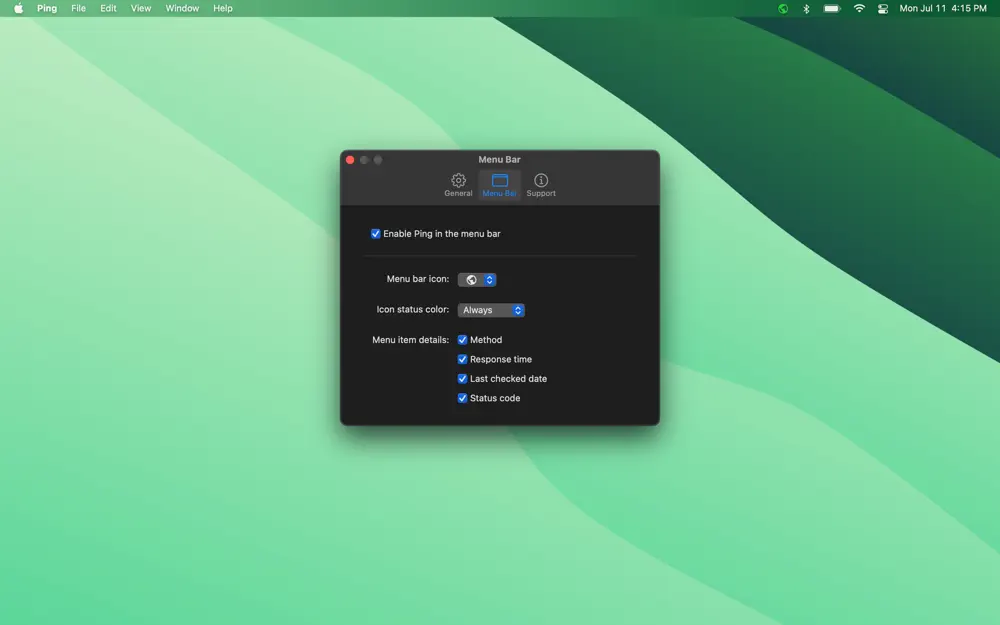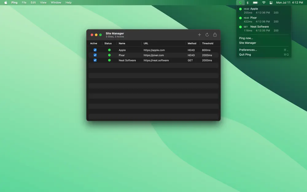 Ping is a simple uptime monitor that uses your Mac's internet connection. Keep track of the status & speed of websites, APIs, servers, routers or any network device and get feedback directly in your menu bar and via local notifications.